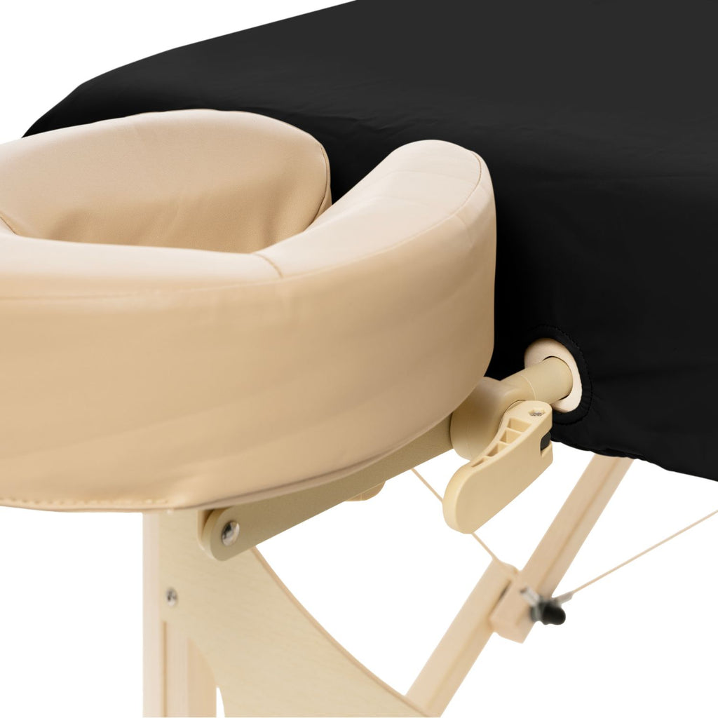 Het hoeslaken is passend voor de meeste massagetafels en sluit mooi aan dankzij de rechte pasvorm. Daarnaast zitten er 2 gaten in het hoeslaken, om eenvoudig de stangen van een hoofdsteun doorheen te doen. Omdat het materiaal minder elastisch is dan bijvoorbeeld badstof, raden we bij kleinere tafels of ovale hoeken het gebruik van een of twee lakenspanners aan om het laken strak te trekken.