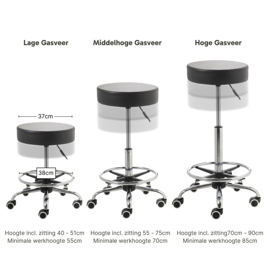 Abhängig von der gewünschten Sitz- oder Arbeitshöhe bieten wir verschiedene Gasfedern an. Arbeitest du an einem niedrigen Tisch? Dann ist die niedrige Gasfeder ideal! Arbeitest du hingegen an einem hohen (Massage-)Tisch? Dann ist die hohe Gasfeder die richtige Wahl. So kannst du sicher sein, immer die richtige Arbeitshöhe zu haben.